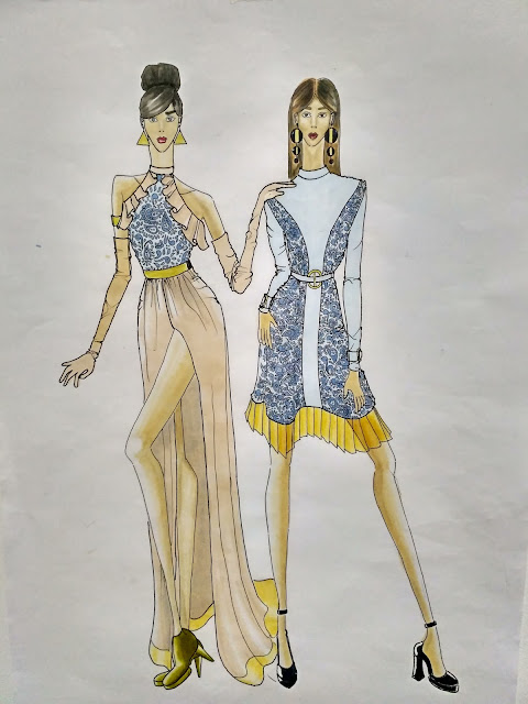 The first garment that I have designed is a floor length gown. It has an A-line silhouette which accentuates the wearer's waist. This gown has flouncing details sewn on the halter neckline, which was largely inspired by Gucci's two-piece suit. The skirt of the gown has a train at the back, creating a trail of fabric when the wearer struts the red carpet. It also features an opening at the front of the skirt, exposing the legs of the wearer. The accent fabric is sewn at the hem, giving the skirt an extension of fabric. The gown is accessorized with a black faux leather belt with a gold plate at the front, a pair of gold triangular shaped earrings and gold arm cuffs. This looks is for the celebrity who wishes to show off their beautiful figure, to look sexy but elegant at the same time.